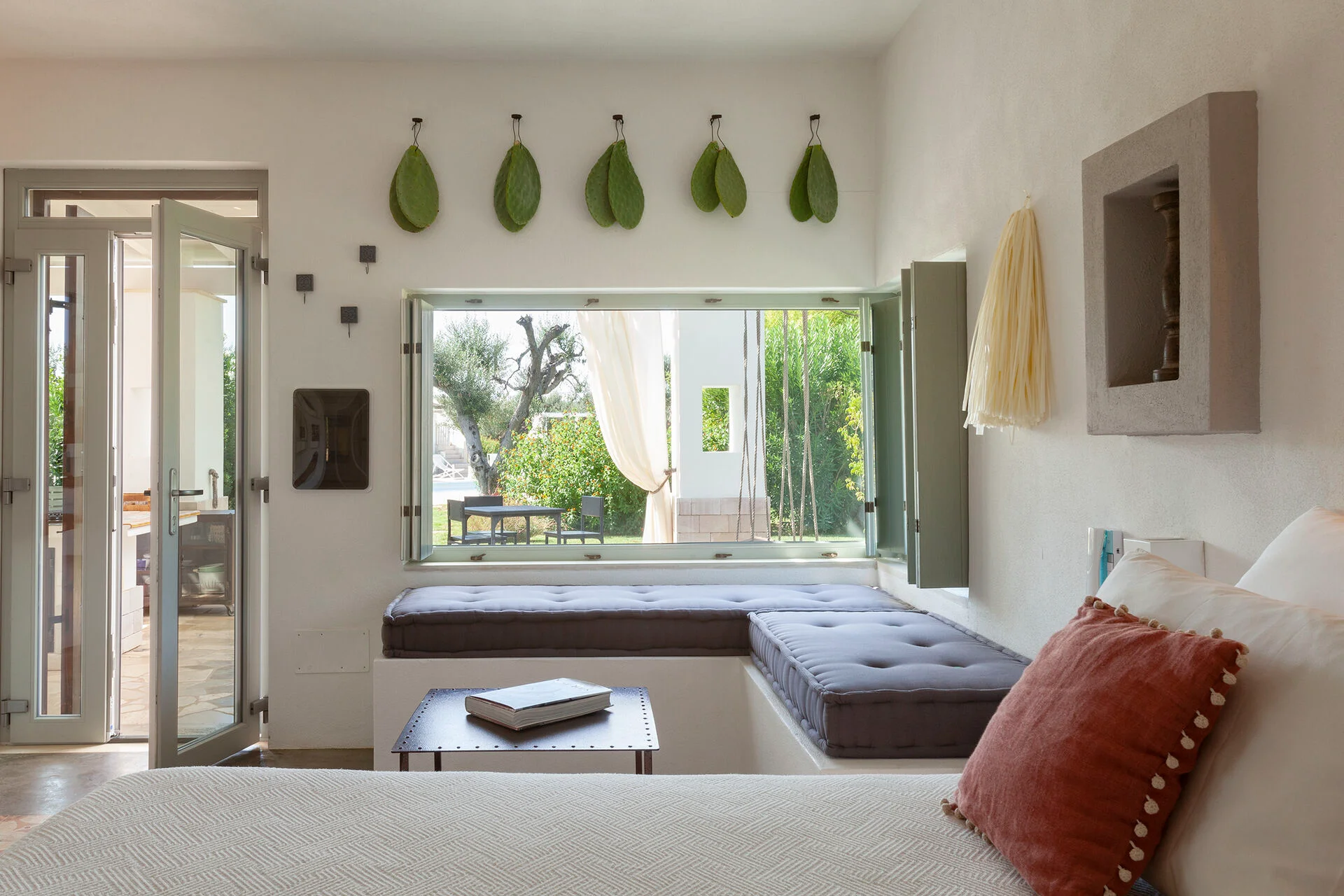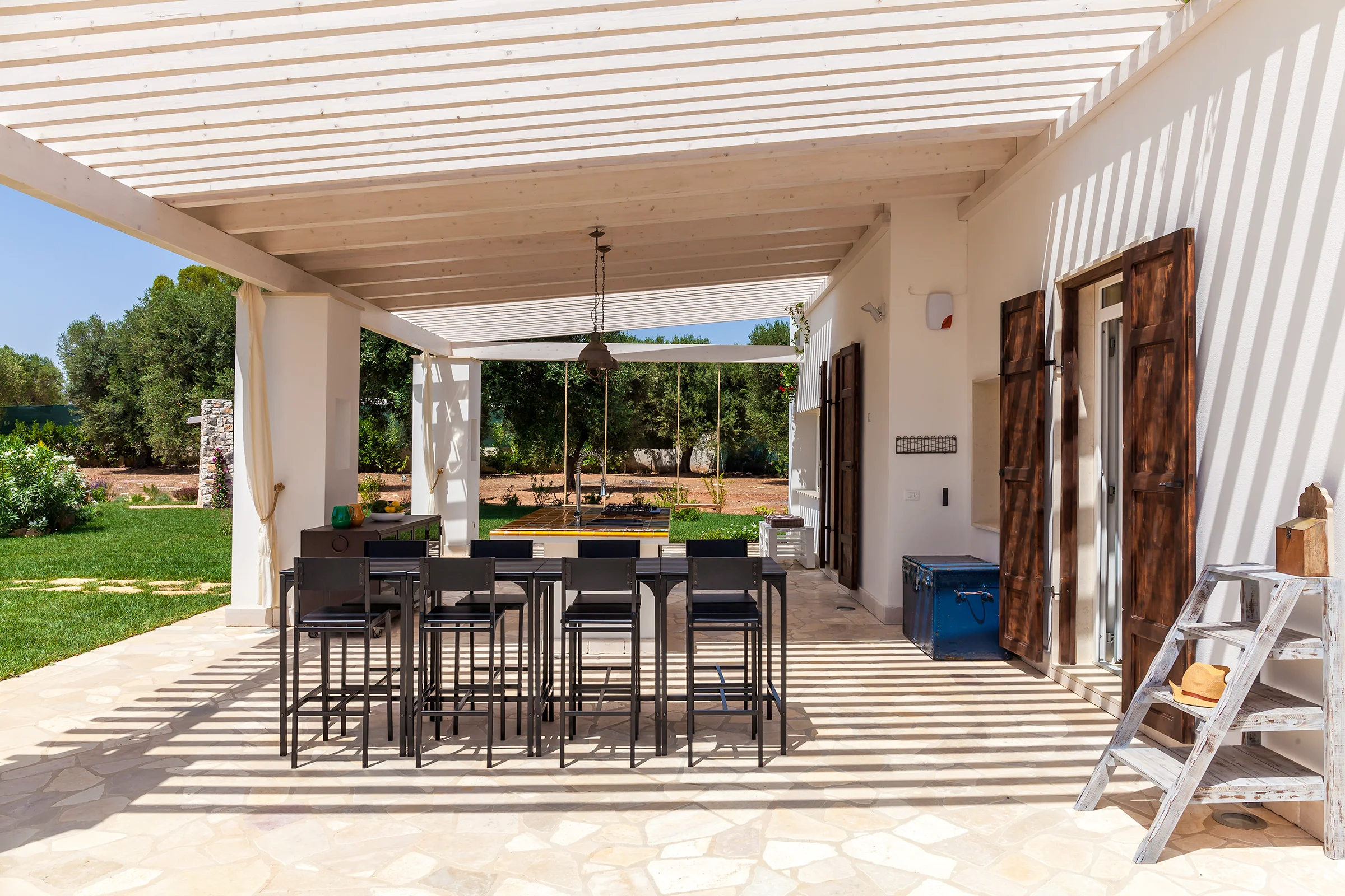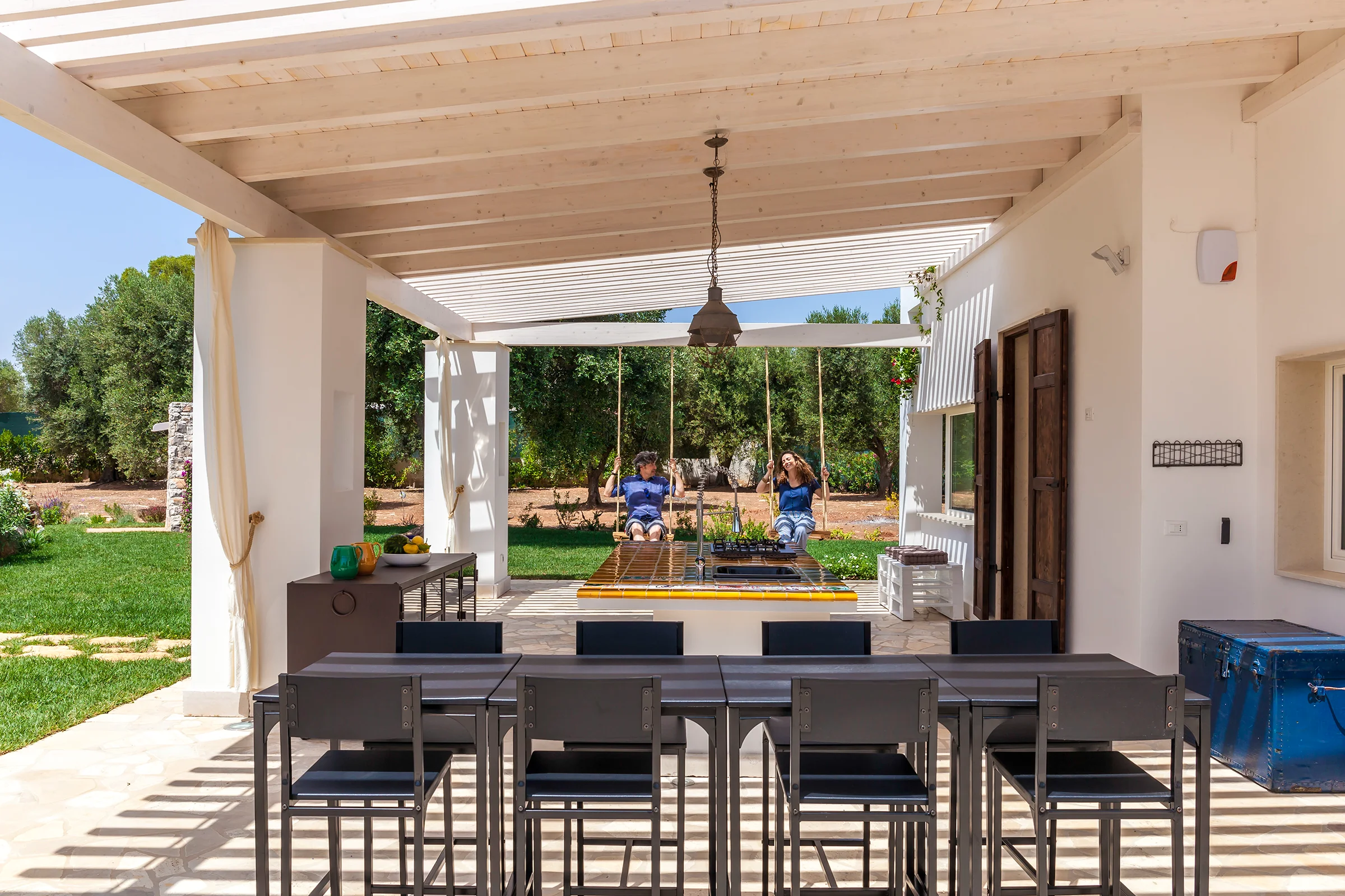 The villa features two spacious patios, the heart of family life. These open-air living rooms blend with the garden, framed by tuff arches, olive-wood details, and soft lighting that glows warmly at sunset. By day, they offer shade and a gentle breeze, becoming natural gathering points for rest, reading, or planning excursions.